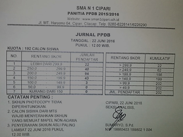 Tanggal : 22/06/2016Hari ini Rabu, 22 Juli 2016 Pendaftaran Peserta Didik Baru tahun pelajaran 2016/2017 Resmi ditutup jam 12.00 WIB. Posisi terakhir pendaftar adalah sebagai berikut :