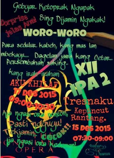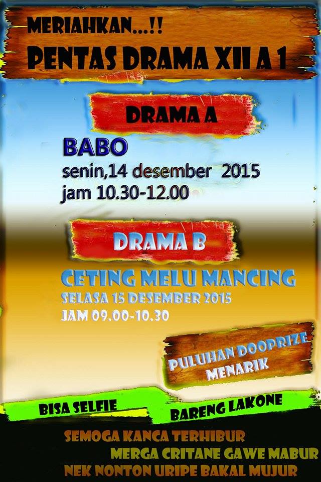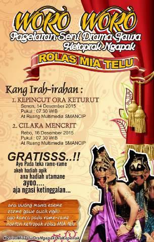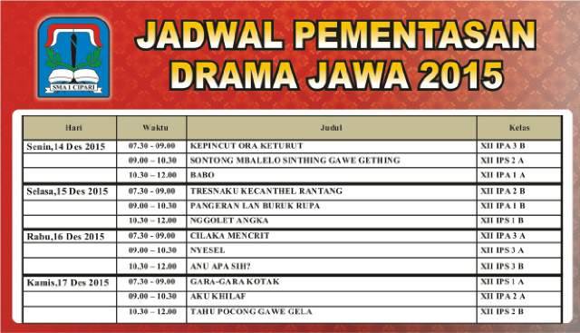 Tanggal : 12/12/2015Dalam rangka mengisi kegiatan selepas UAS 1 tahun pelajaran 2015/2016. Komunitas pecinta Budaya Jawa SMA Negeri 1 Cipari akan menggelar Drama Tradisional berbahasa Jawa yang akan di ikuti oleh seluruh Grup Drama Tradisional seluruh kelas XII SMA Negeri 1 Cipari.